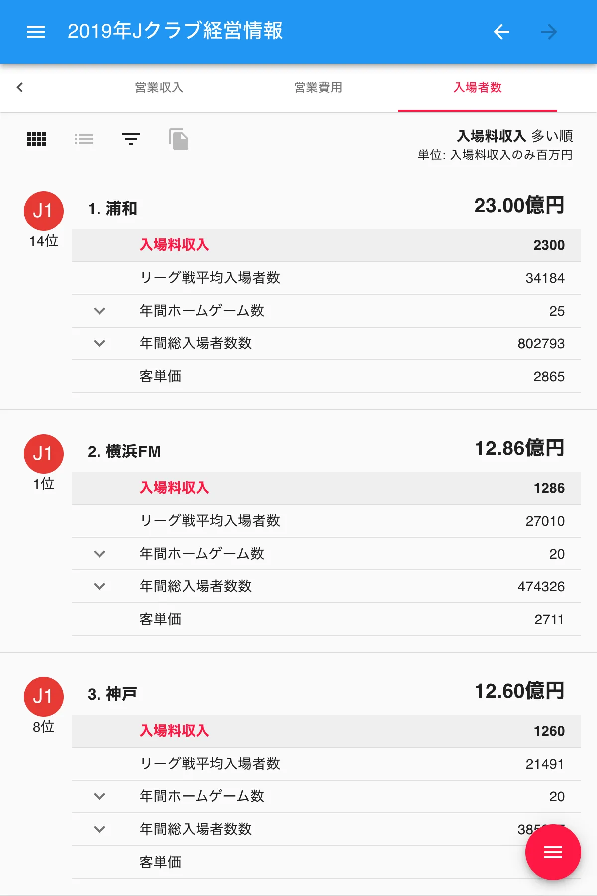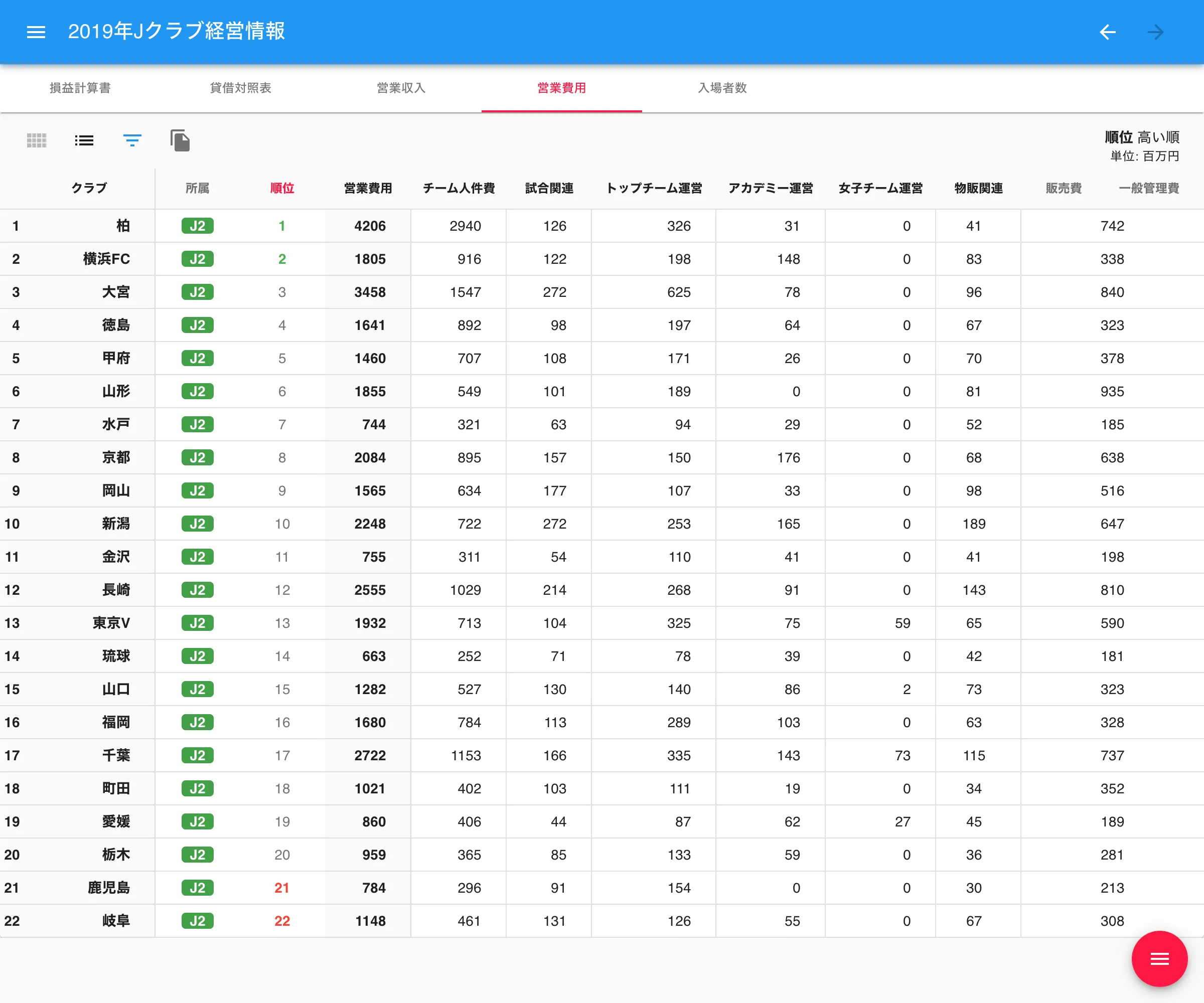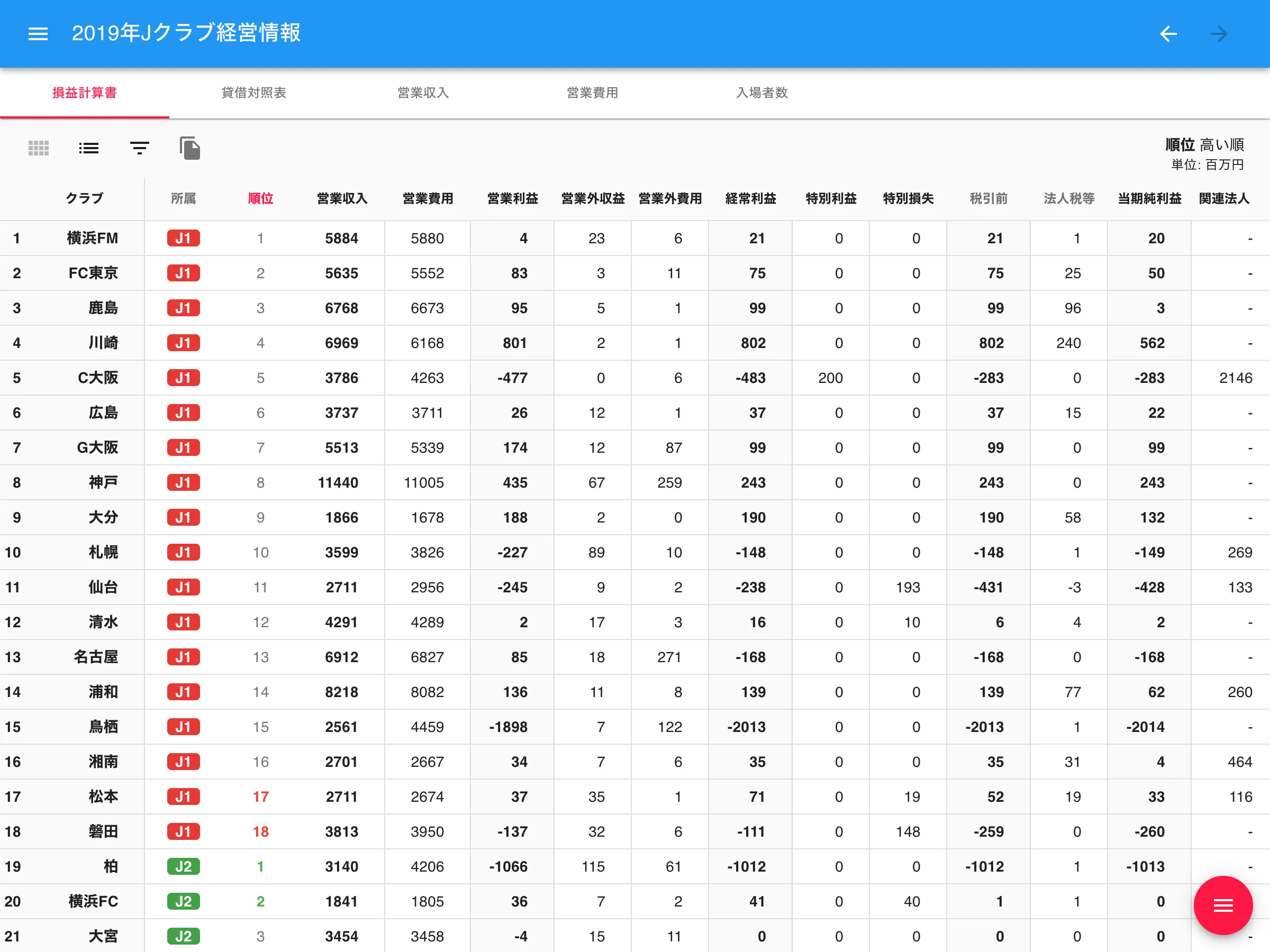 Jリーグが毎年公開している「Jクラブ個別経営情報開示資料」のデータをクラブ別、年度別に表示したページ。損益計算書、貸借対照表、営業収入、営業費用、入場者数の項目別に表と解説を掲載。