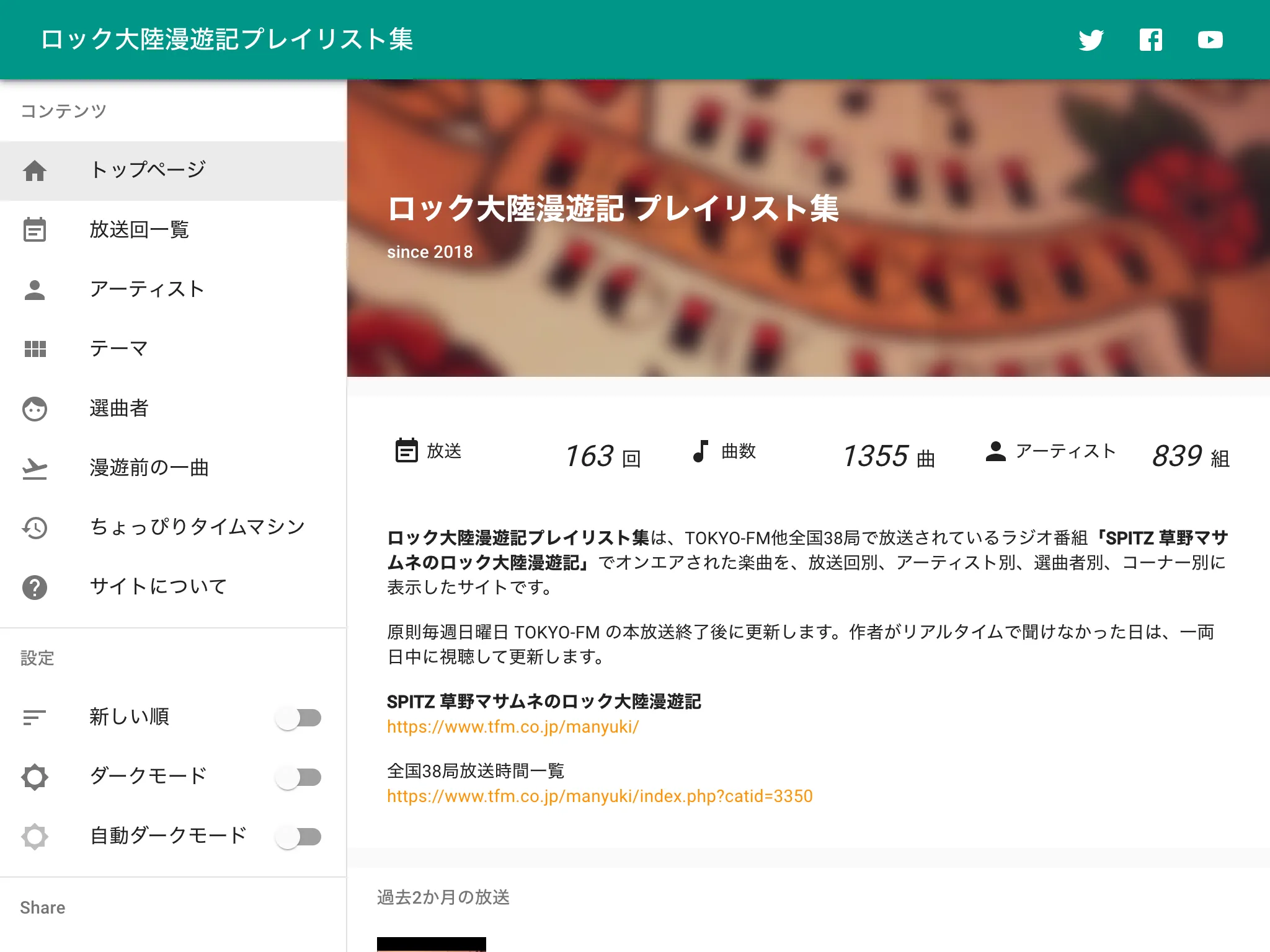 ロック大陸漫遊記は初回からのプレイリストが番組ホームページに掲載されていますが、アーティスト別、選曲者別の分類があるといいなと思い、作ってみました。基本的には、自分が見たいもの、作りたいものを作るというスタンスです。実はロック大陸漫遊記が始まった 2018年に一度、 ロック大陸測量部 という ロック大陸漫遊記のオンエア曲を可視化した ページを作っていました。去年の2月まで更新していましたが、このページはメンテナンス性が低く、当初から違う形で作り直すことを考えていました。