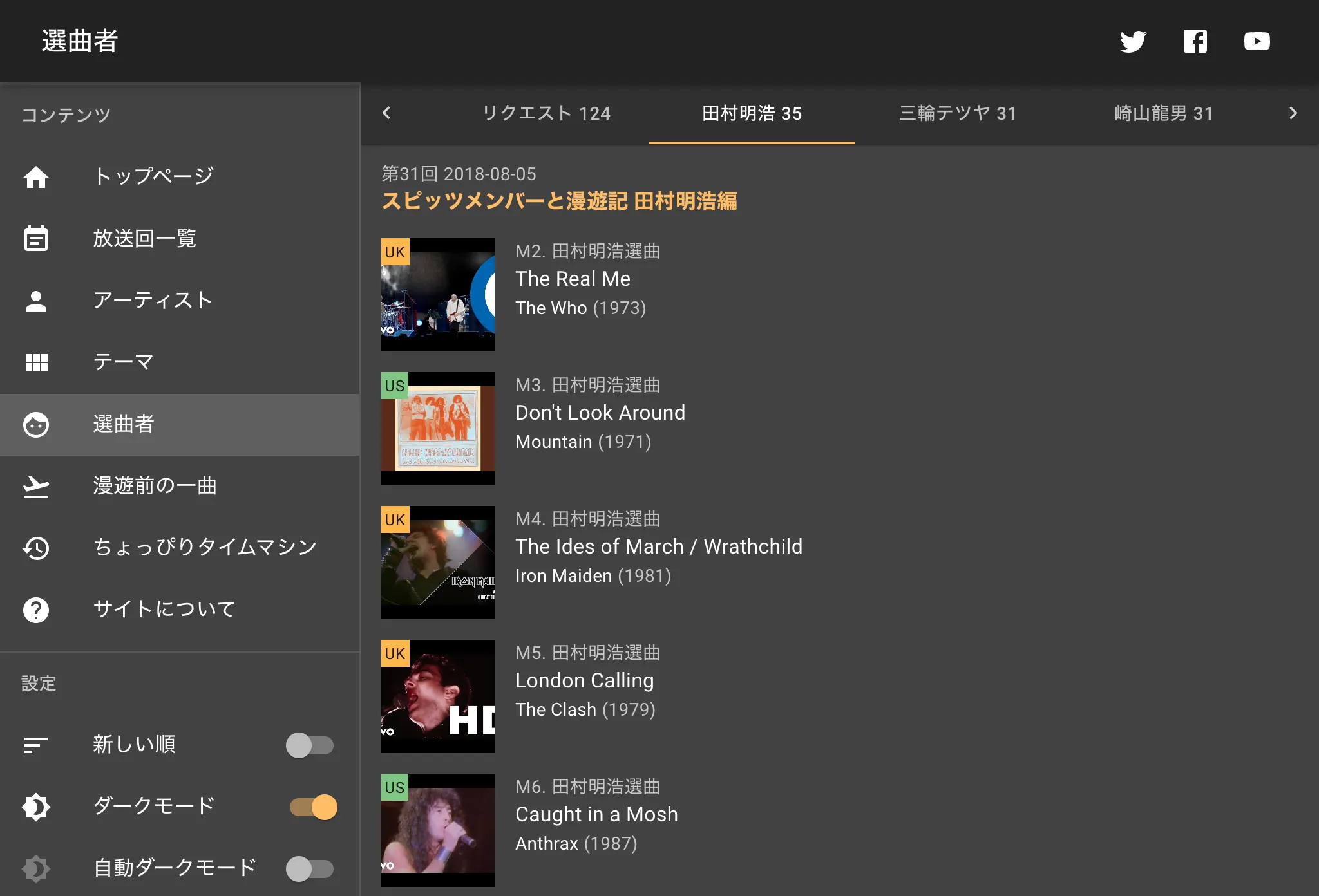 ロック大陸漫遊記プレイリスト集は、TOKYO-FM 他全国38局で放送されているラジオ番組「SPITZ 草野マサムネのロック大陸漫遊記」でオンエアされた楽曲を、放送回別、アーティスト別、選曲者別、コーナー別に表示したサイトです。